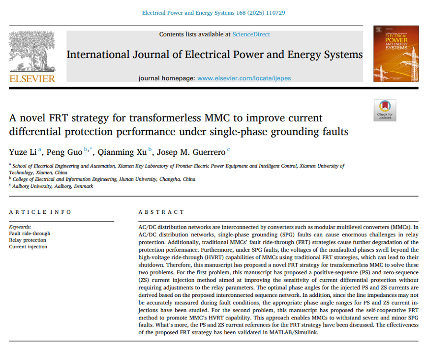 近日,我校电气工程与自动化学院新能源发电与先进电能变换科研团队李昱泽博士与湖南大学电能高效高质转化全国重点实验室团队合作,相继在国际顶级期刊IEEE Transactions on Sustainable Energy和International Journal of Electrical Power & Energy Systems上发表论文。论文题目分别为“Novel Voltage Support Strategies for DGs in Hybrid AC/DC Distribution Networks under Faults”和“A Novel FRT Strategy for Transformerless MMC to Improve Current Differential Protection Performance under Single-phase Grounding Faults”。